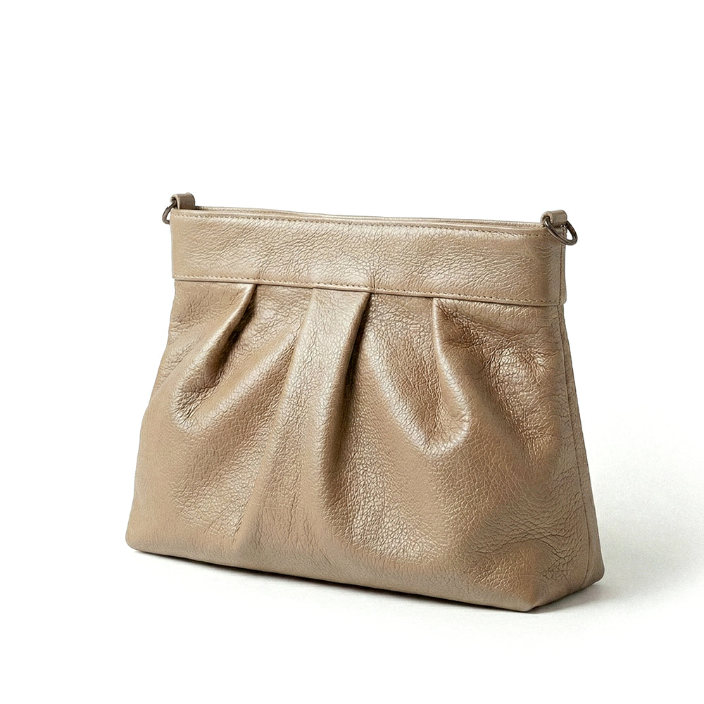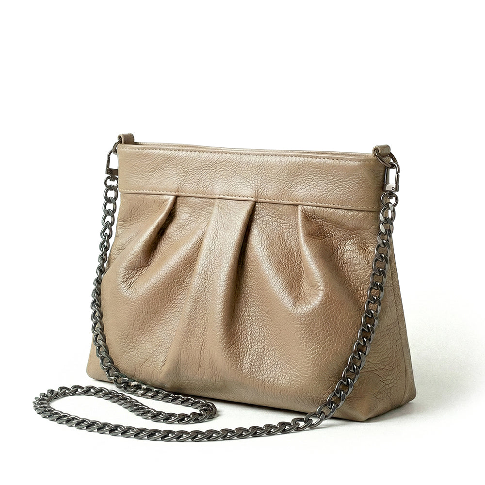 'Involve' is a versatile and elegant leather handbag. This exquisite piece offers three styles: wear it as a chic clutch with a sleek leather shoulder strap, or opt for the sophisticated long-chain strap.