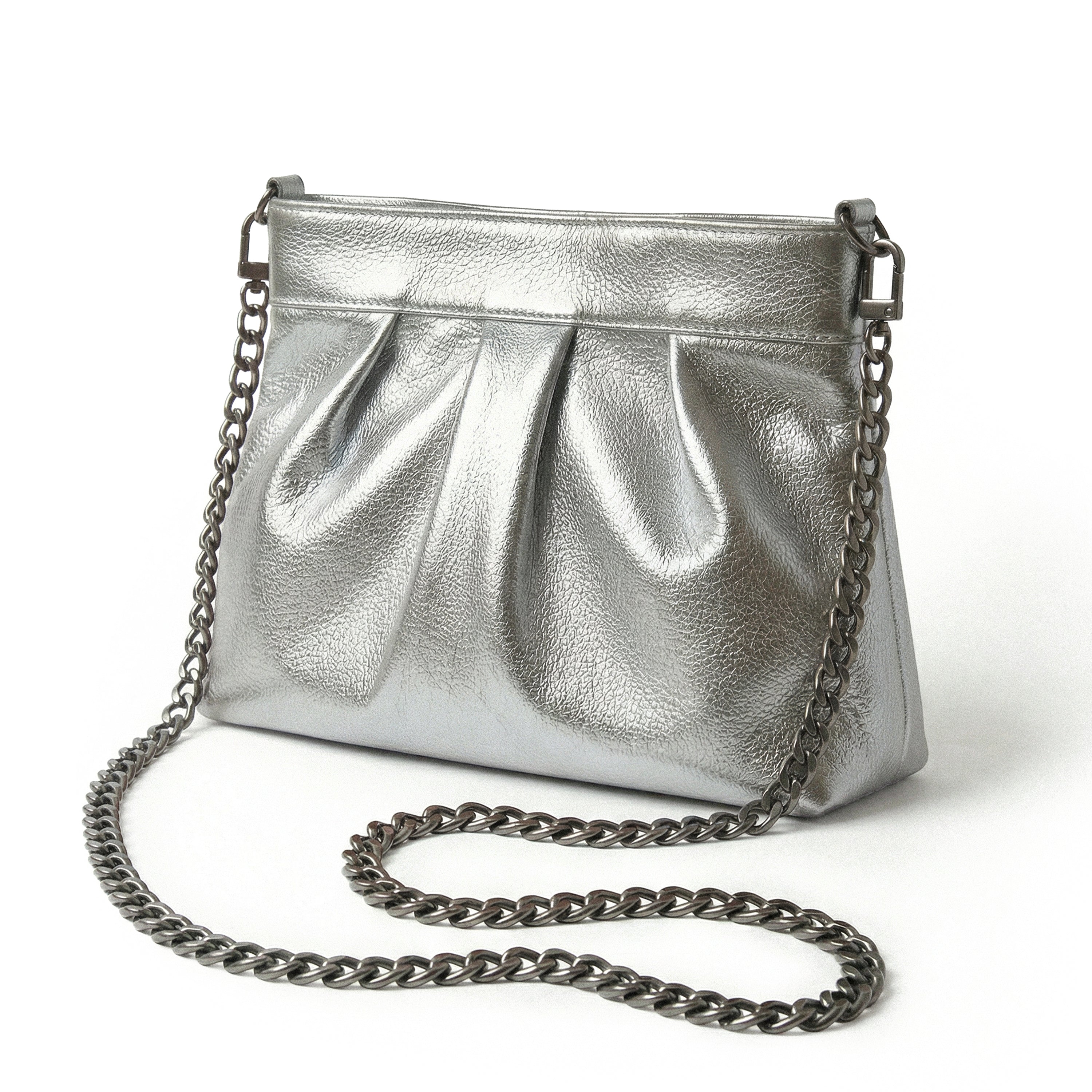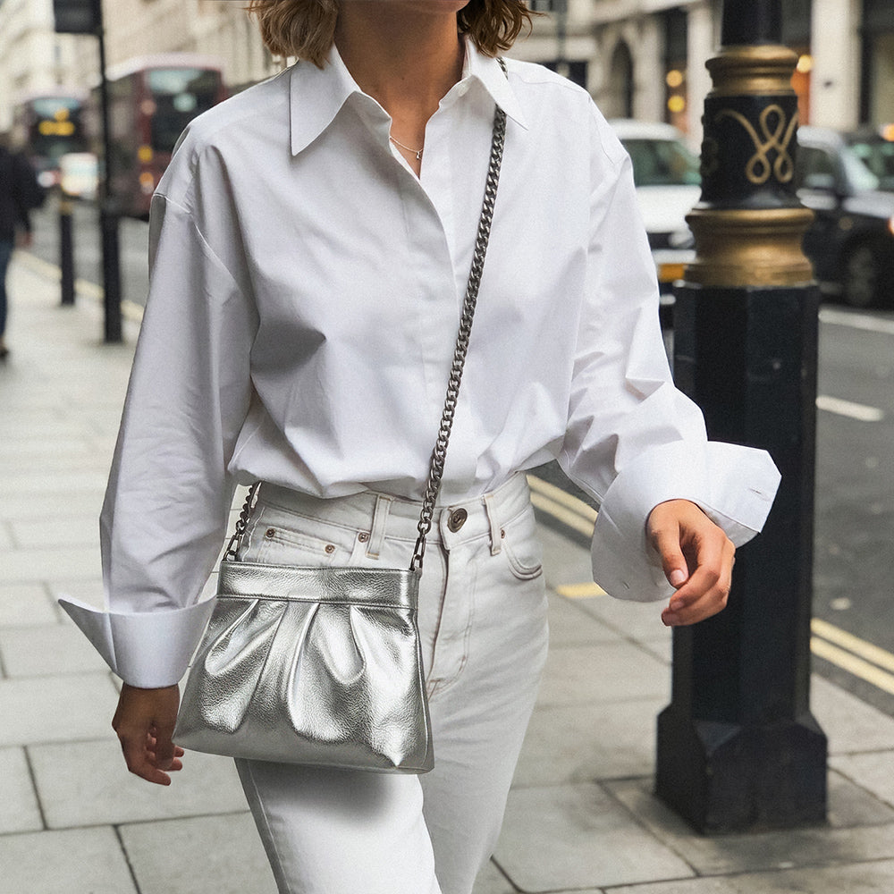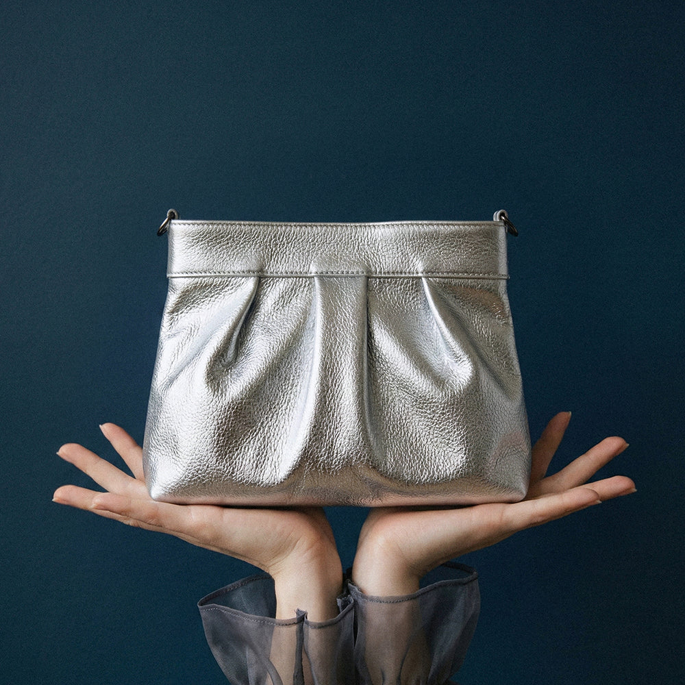 'Involve' is a versatile and elegant leather handbag. This exquisite piece offers three styles: wear it as a chic clutch, with a sleek leather shoulder strap, or opt for the sophisticated long chain strap.
