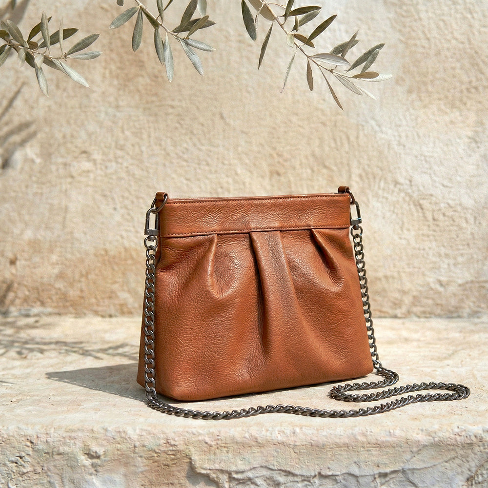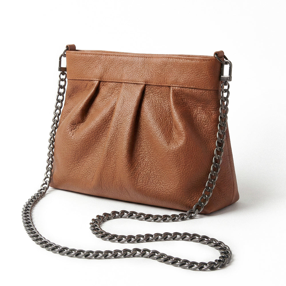 'Involve' is a versatile and elegant leather handbag. This exquisite piece offers three styles: wear it as a chic clutch with a sleek leather shoulder strap, or opt for the sophisticated long-chain strap.