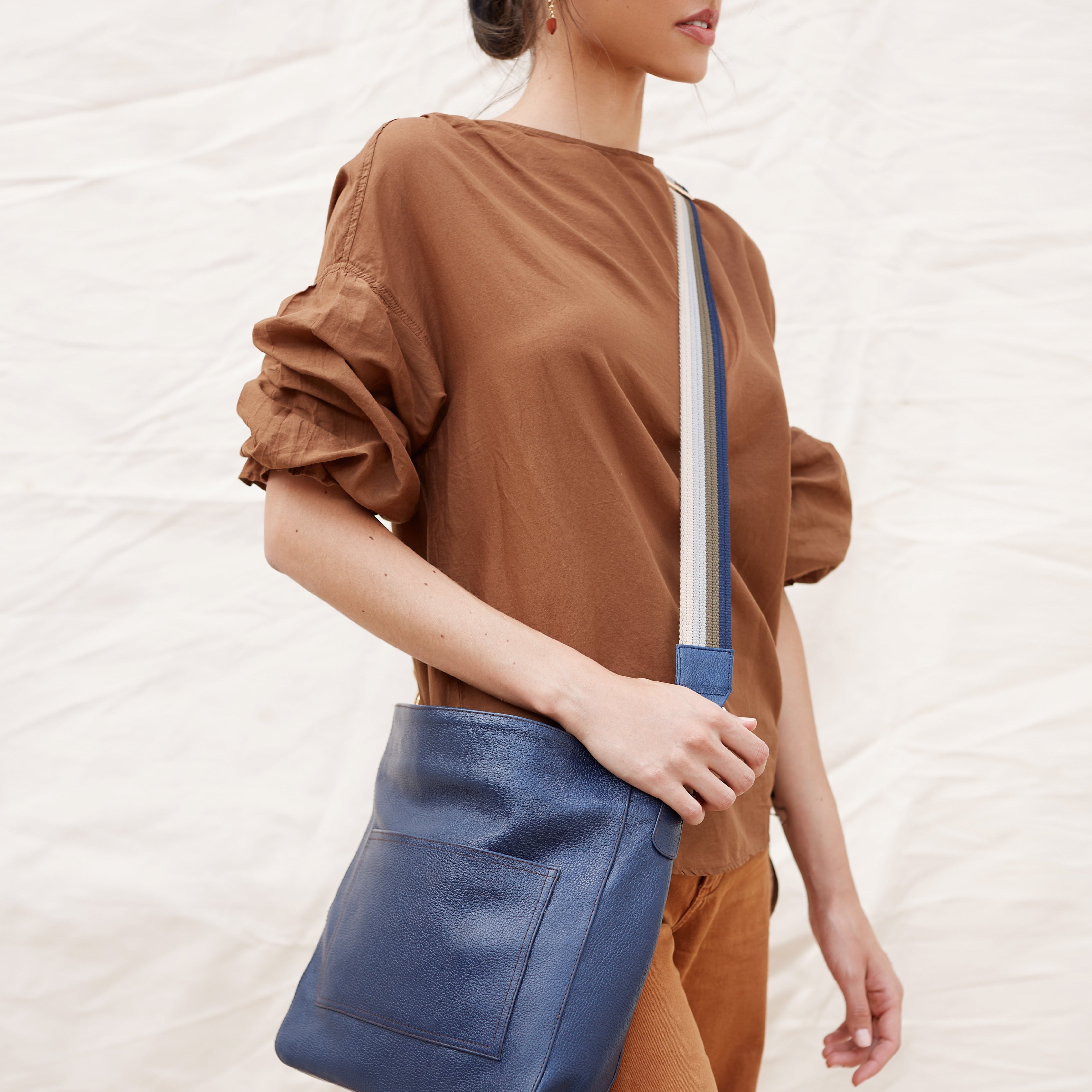 The Pessoa navy blue cross body bag is handcrafted with soft leather. It has a spacious interior with two internal pockets, one with a zipper closure, and an external pocket for easy access to your essentials.